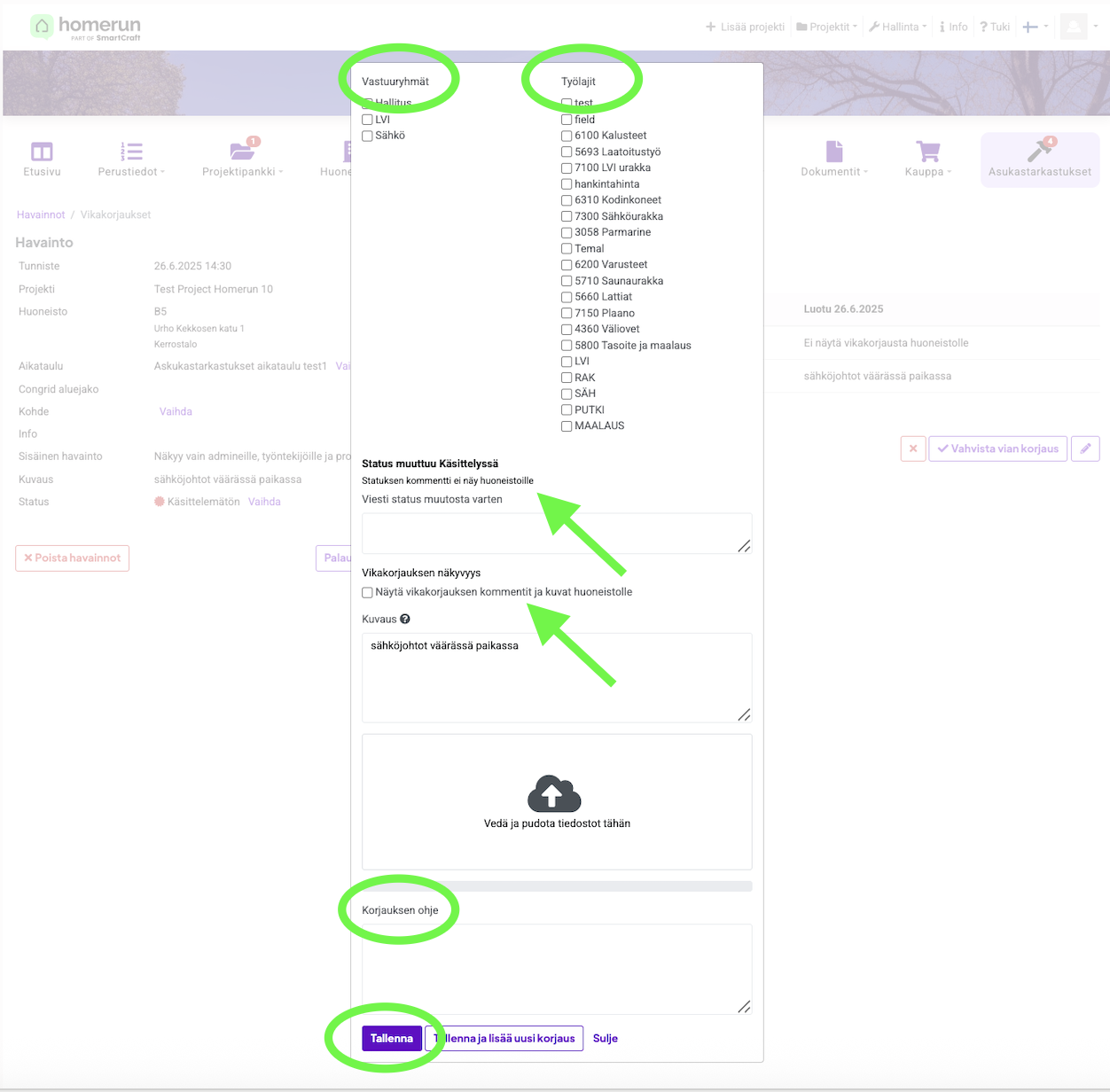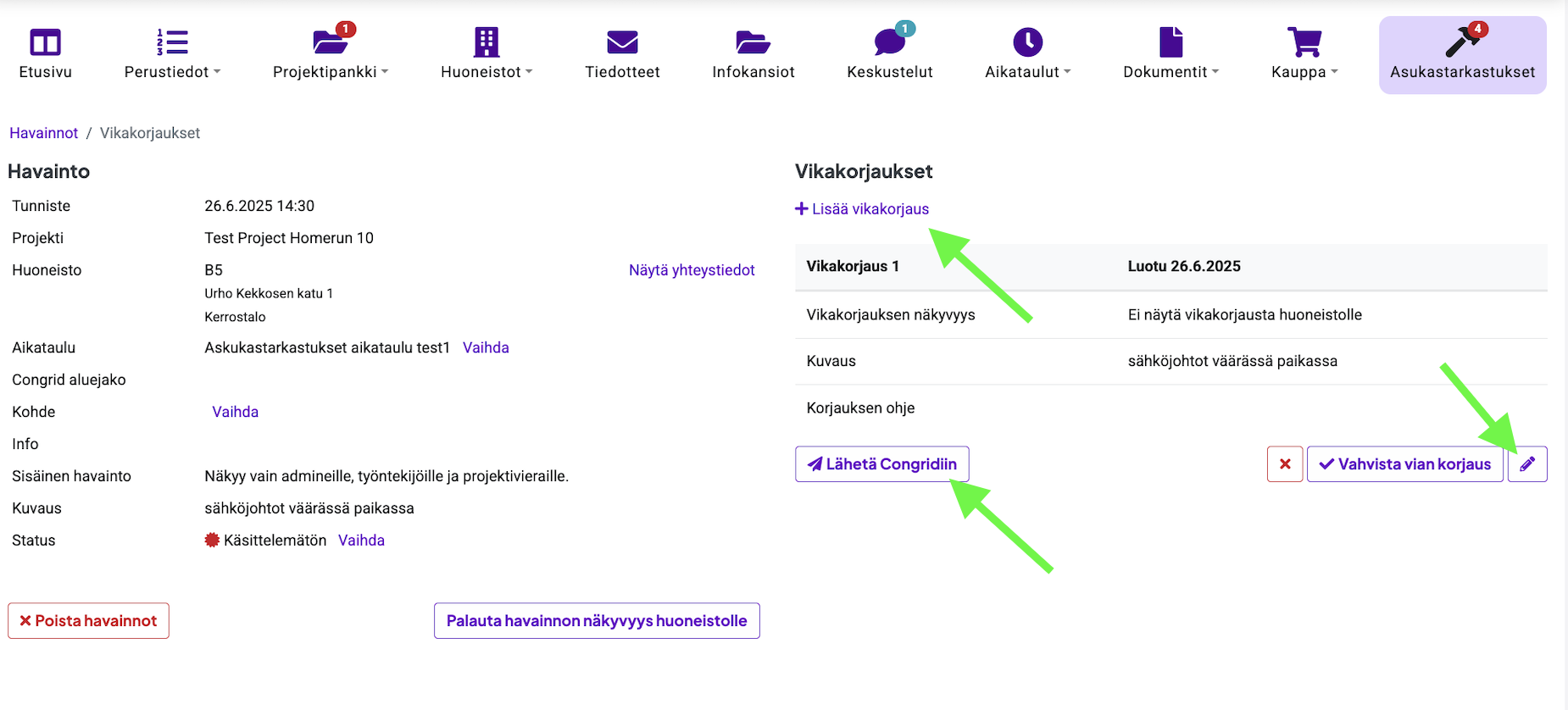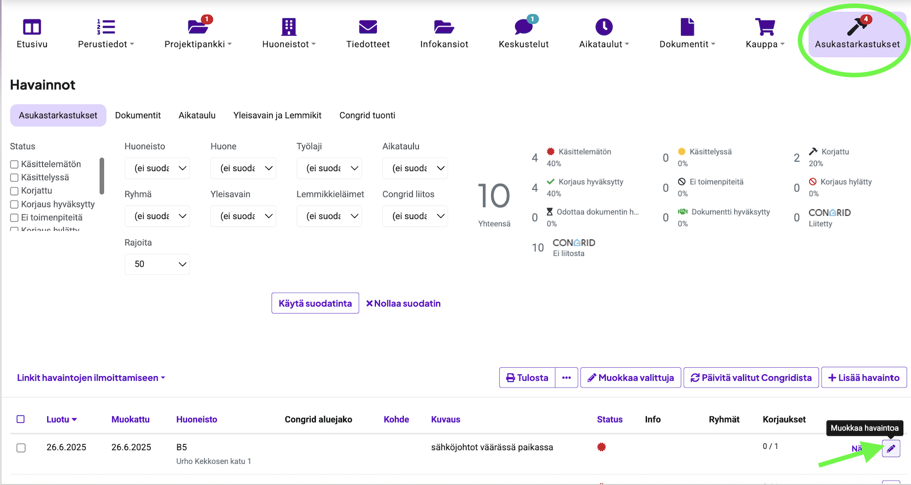 Mene Asukastarkastukset -välilehdelle ja avaa havainto kynäkuvakkeesta
