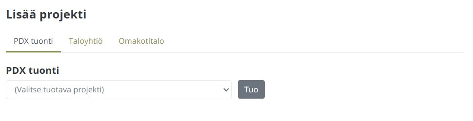 HomeRunissa: +Lisää projekti, valitse taloyhtiö PDX-alasvetovalikosta* → Tuo