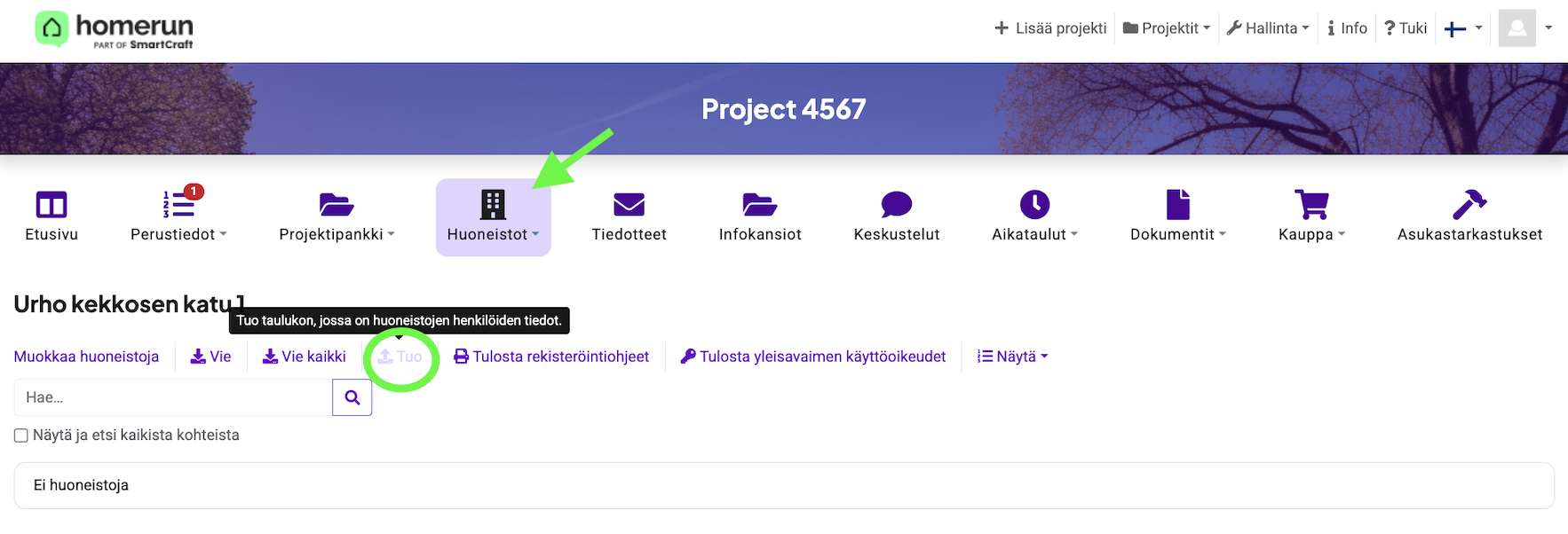 - Tuo: Tuo huoneistotietoja järjestelmään esimerkiksi Excel-tiedostosta.