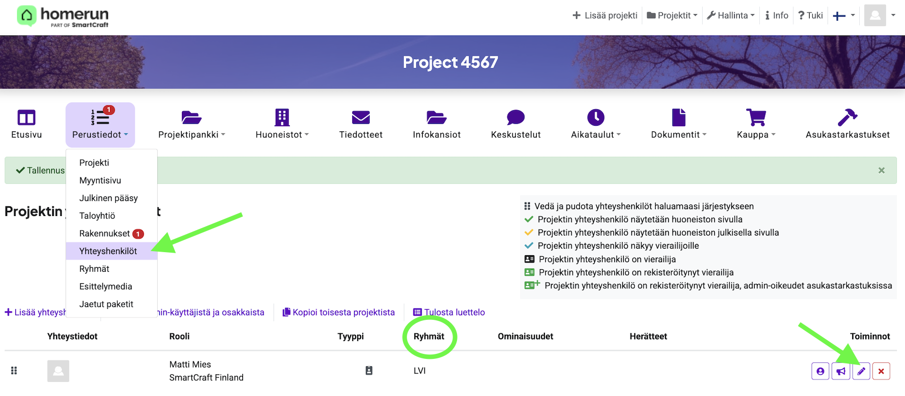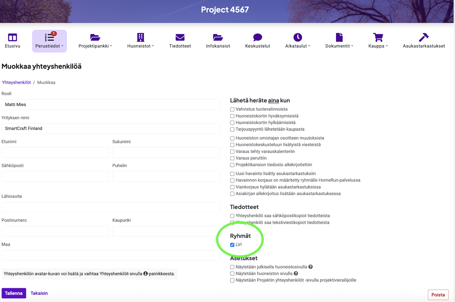 Henkilöt lisätään ryhmiin Perustiedot → Yhteyshenkilöt -sivun kautta.