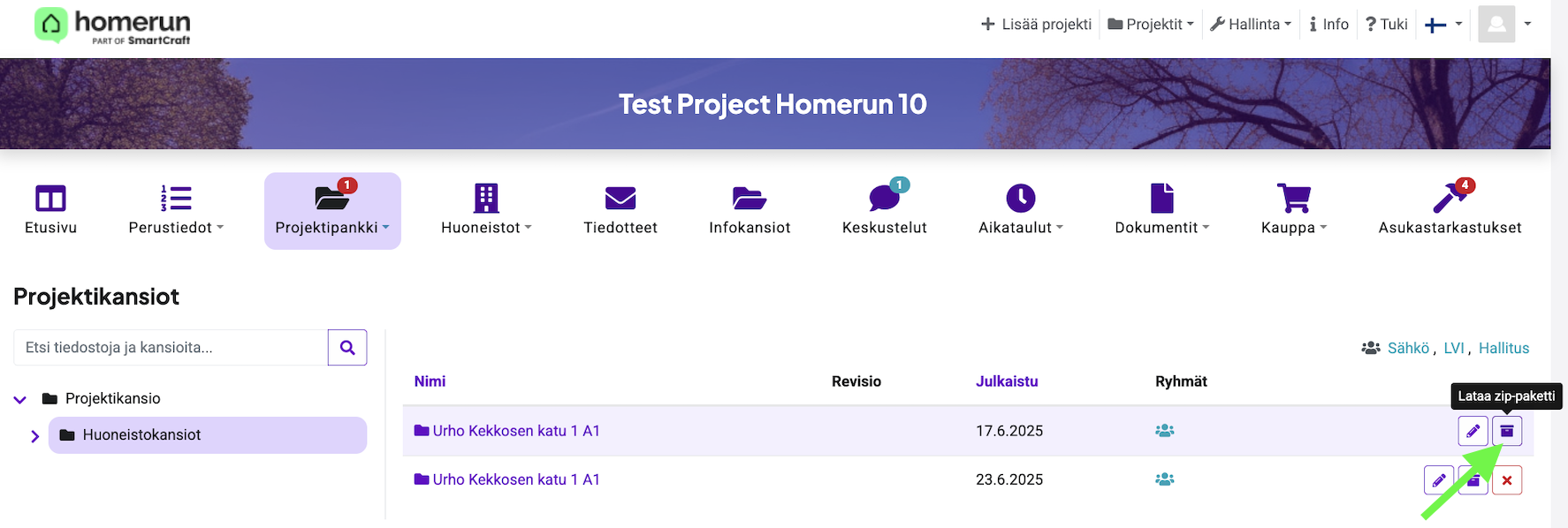 Projektikansioiden sivulla on mahdollista: