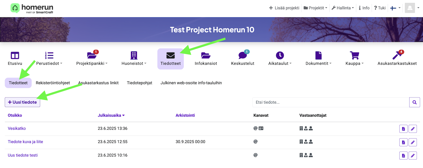 Aloita uuden tiedotteen luominen painamalla +Uusi tiedote
