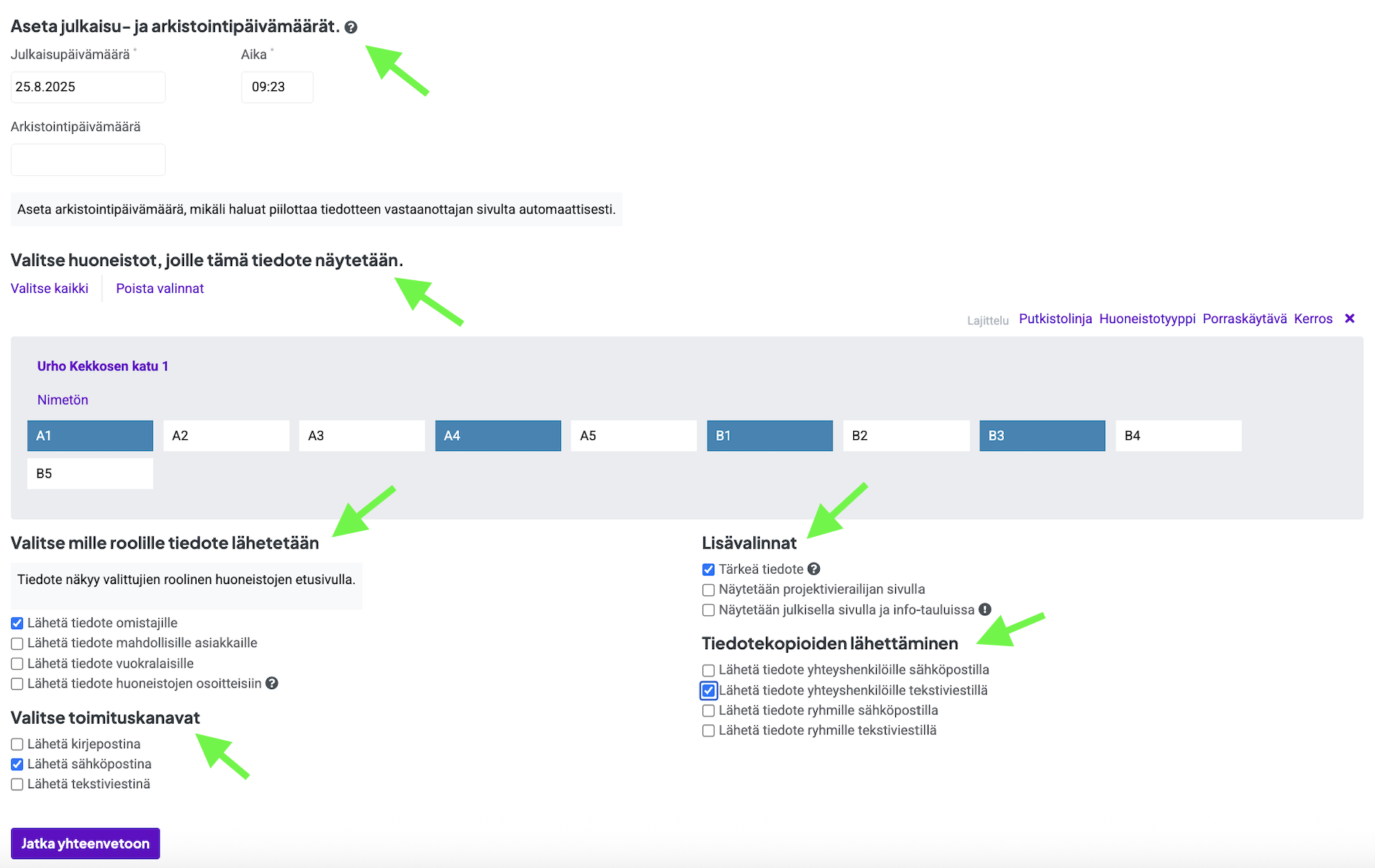 Julkaisun ja arkistoinnin ajankohdat voidaan määrittää tarkasti, ja tiedote voidaan kohdentaa halutuille huoneistoille ja rooleille. Lisävalinnoilla voit merkitä tiedotteen tärkeäksi, julkaista sen julkiselle sivulle ja info-tauluihin sekä lähettää kopiot sähköpostilla tai tekstiviestillä yhteyshenkilöille ja ryhmille.