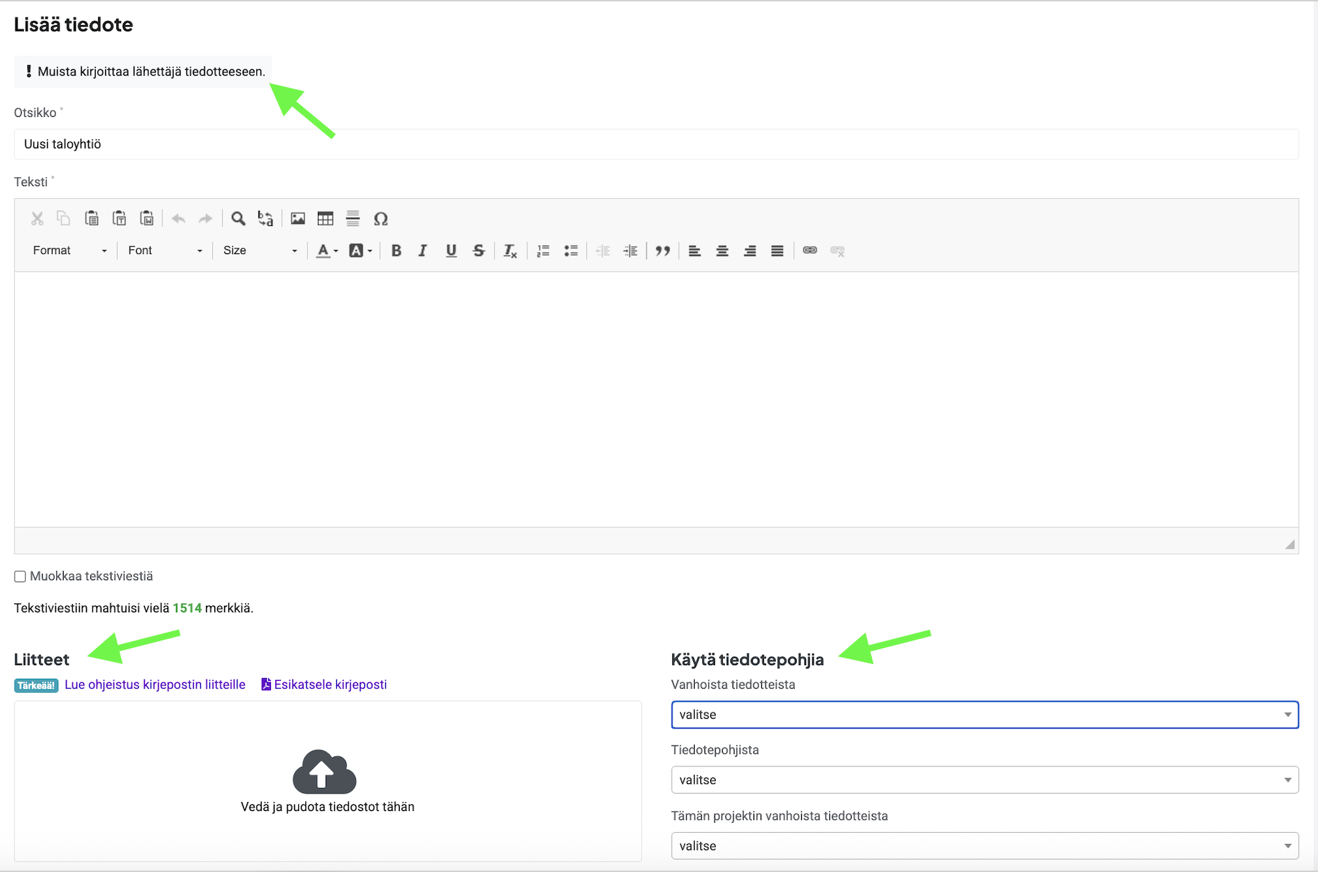 Voit kirjoittaa otsikon ja tekstin, lisätä liitteitä sekä hyödyntää valmiita tiedotepohjia.