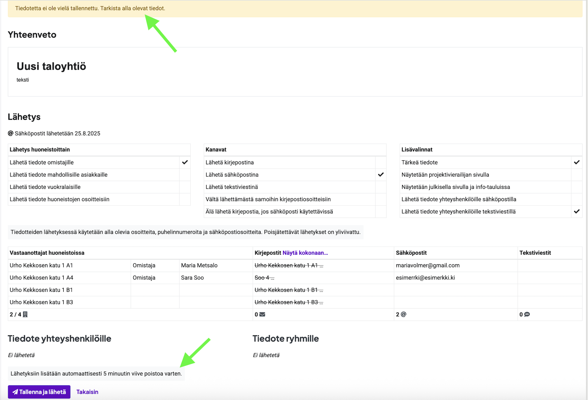 Lähetyksiin lisätään automaattisesti 5 minuutin viive, jonka aikana voit vielä peruuttaa tiedotteen lähetyksen, jos huomaat virheen tai haluat tehdä muutoksia.