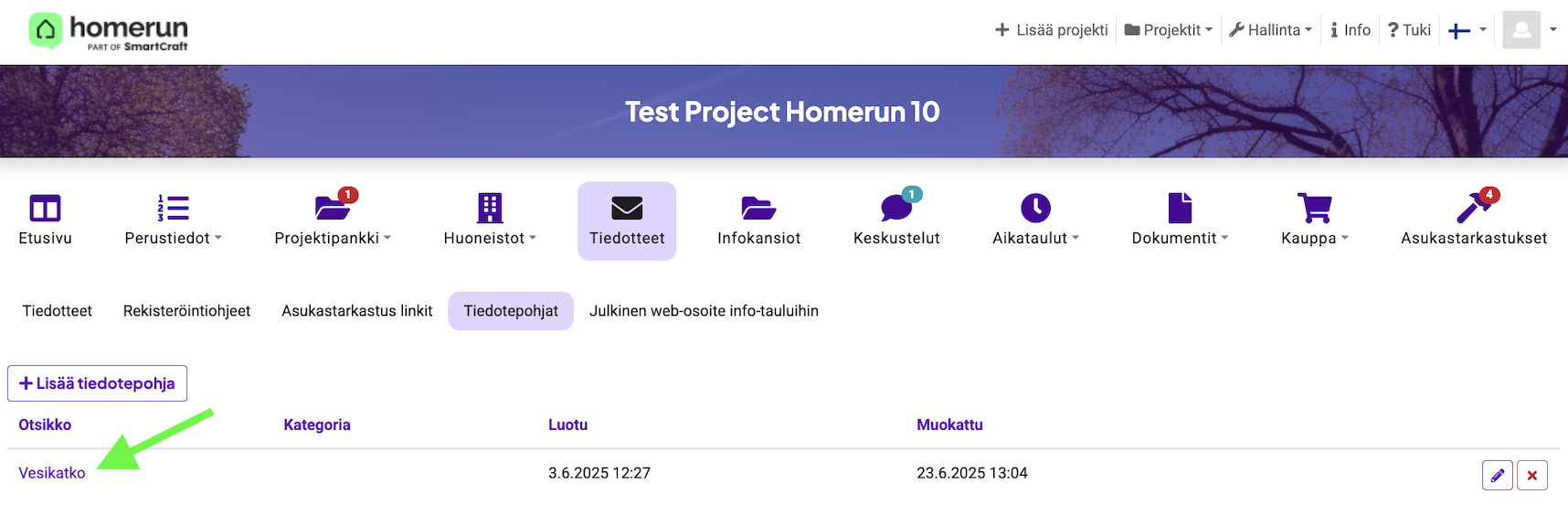 Kun olet tallentanut tiedotepohjan, se lisätään automaattisesti tiedotepohjalistaan. Voit käyttää tallennettuja pohjia helposti uudelleen, kun luot uusia tiedotteita.