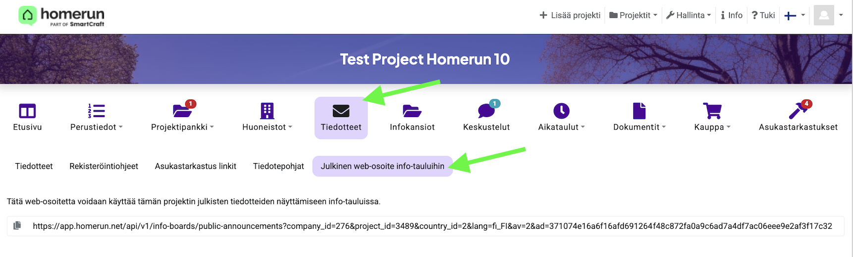 Linkki vie suoraan tiedotteeseen, joka on merkitty julkiseksi ja näkyy projektin julkisella sivulla. Jos haluat, että tiedote näkyy julkisella sivulla ja info-tauluissa, muista valita "Näytetään julkisella sivulla ja info-tauluissa " -valintaruutu ennen lähettämistä. Huom! Liitetiedostot eivät ole tällä hetkellä saatavilla info-tauluissa.