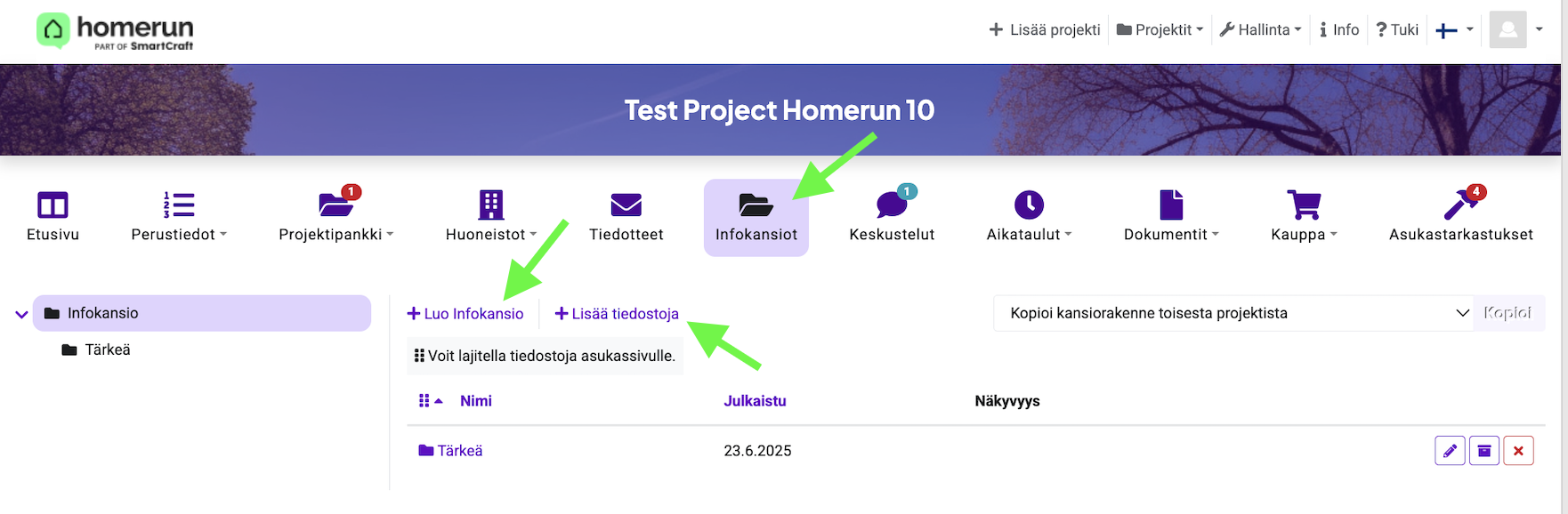 Voit lisätä infokansioita ja tallentaa niiden sisälle tiedostoja, kuten ohjeita, dokumentteja tai ilmoituksia.
