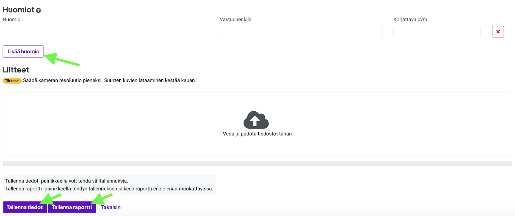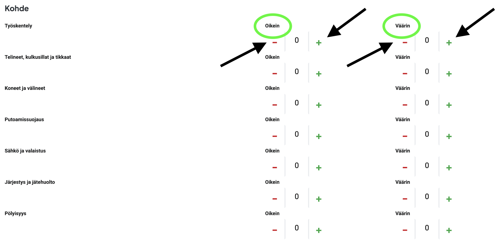 Jokaisesta osa-alueesta merkitään Oikein tai Väärin havainnot. Voit myös lisätä huomioita ja liitteitä (esim. kuvia), mutta huomioi, että suurikokoisten kuvien lataaminen voi kestää kauan.