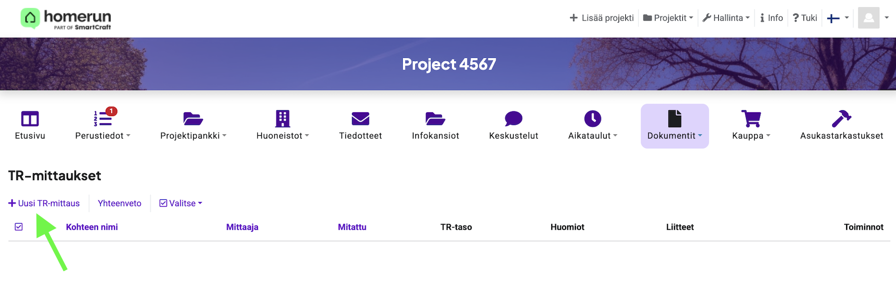 Voit aloittaa uuden TR-mittauksen painamalla + Uusi TR-mittaus TR-mittaukset-sivulla
