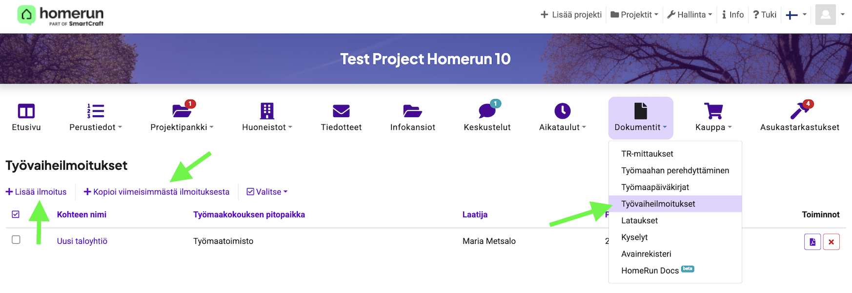 Työvaiheilmoitukset-sivulla käyttäjät voivat hallita ja dokumentoida työmaan eri vaiheisiin liittyviä ilmoituksia: