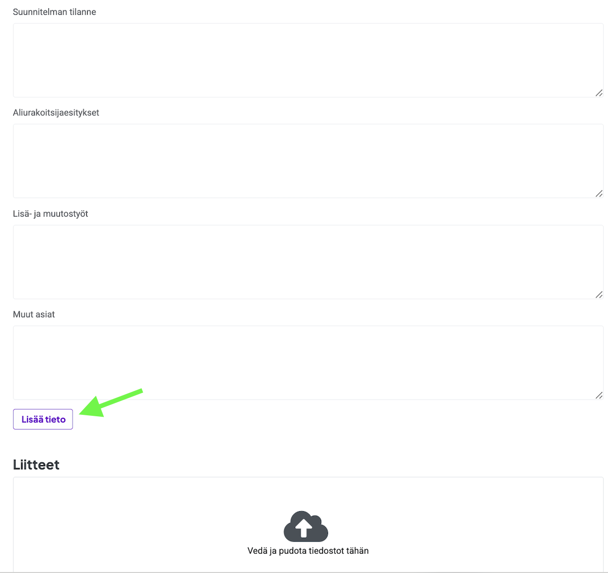 Lomakkeen toisessa osassa käyttäjä voi kuvata suunnitelman tilanteen, aliurakoitsijaesitykset, lisä- ja muutostyöt sekä muut asiat. Tiedot voidaan täydentää painikkeella "Lisää tieto", ja tarvittavat liitteet voi lisätä raahaamalla ne liitealueelle.