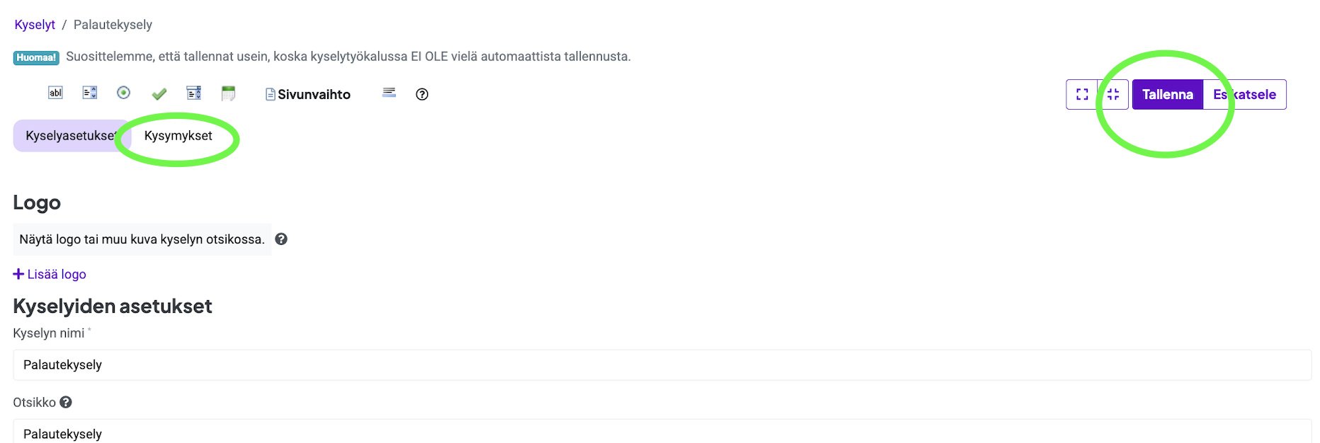 On tärkeää huomioida, että kyselytyökalussa ei ole automaattista tallennusta, joten tietojen tallentaminen manuaalisesti on suositeltavaa työn aikana