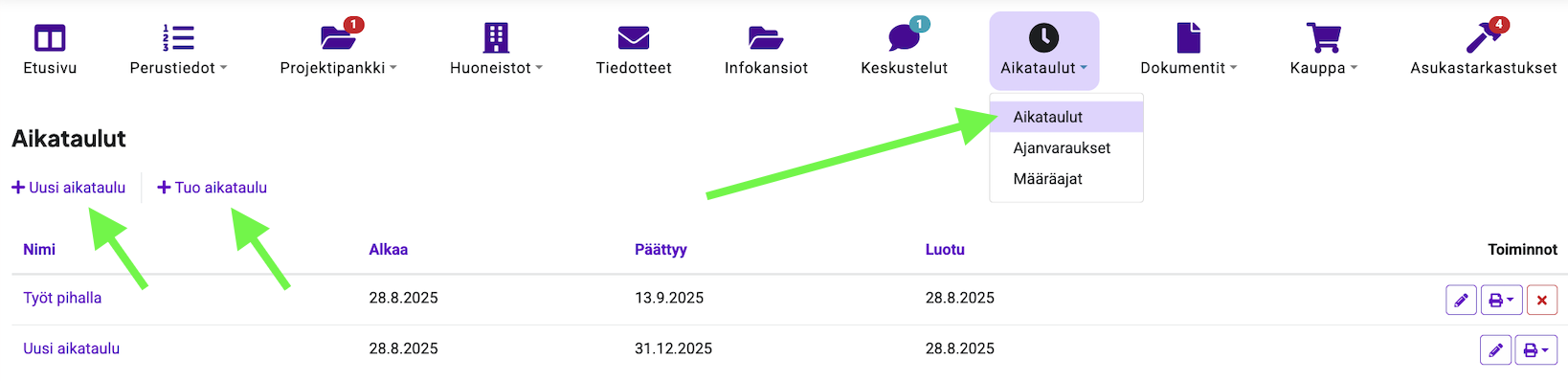 Aikataulut-osiossa voit luoda uuden projektiaikataulun (+Uusi aikataulu) tai ladata valmiin aikataulutiedoston (+Tuo aikataulu),