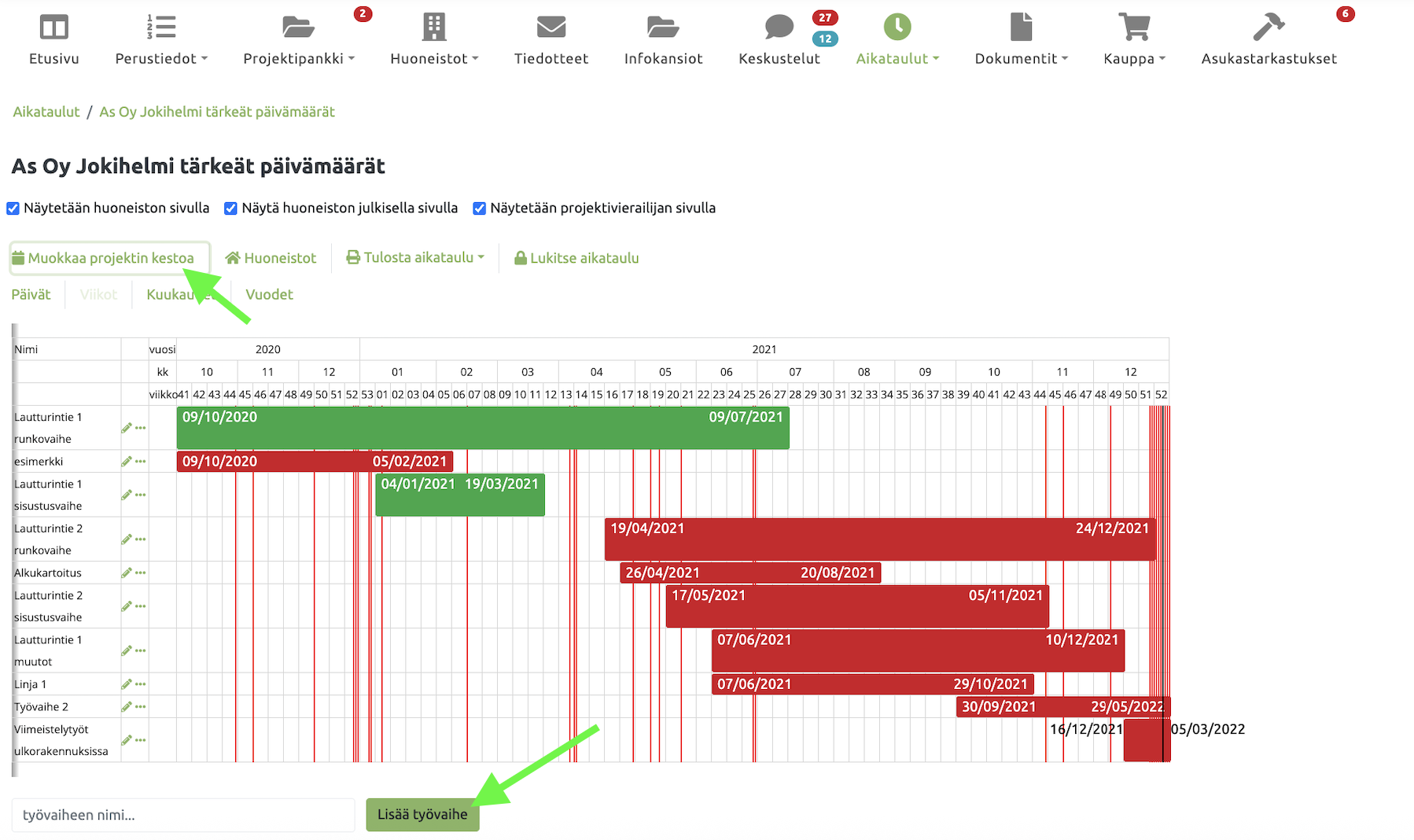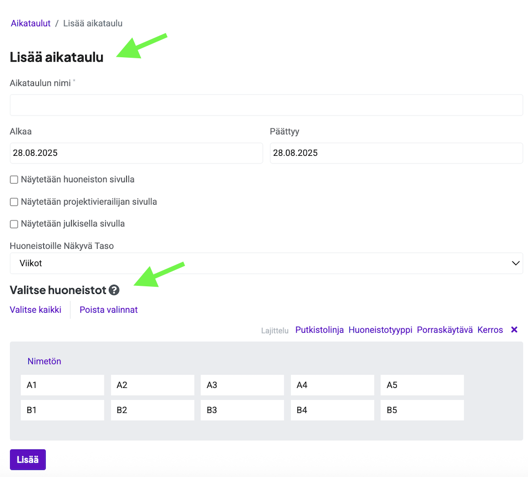Aikataulun nimeä käytetään palvelun sisällä. Se myös näkyy asiakkaille ja tulostuu PDF-tulosteisiin. Aseta aikataulun alku- ja loppupäivämäärät. Aikataulun voi asettaa näkymään huoneistolle, projektivierailijalle ja julkiselle sivulle. Voit valita myös huoneistolle näkyvän aikataulun tason. On tärkeätä huomata, että jos aikataulu määritetään huoneistoille näkyväksi, se näkyy vain niille huoneistoille, jotka ovat valittuna huoneistovalitsimessa.