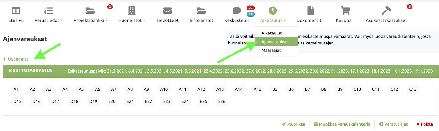 Täällä voit aikatauluttaa huoneistojen esikatselmuspäivämäärät. Voit myös luoda varauskalenterin, josta huoneistojen omistajat voivat varata esikatselmusajan.