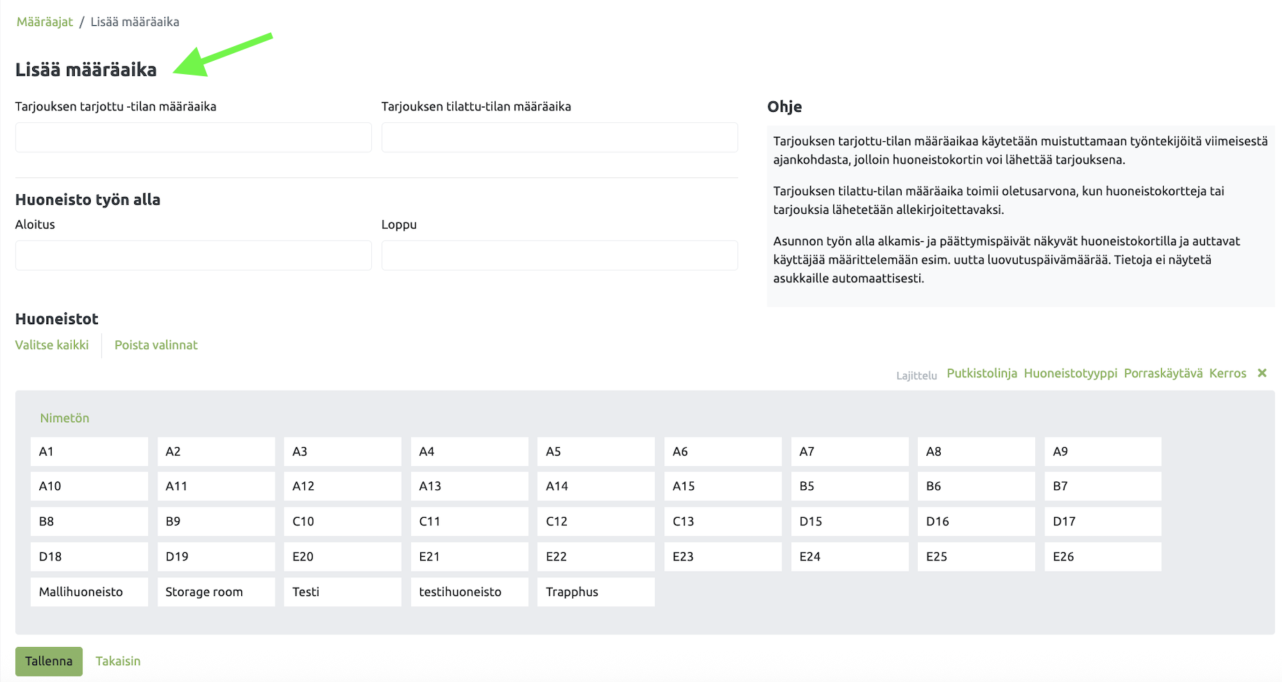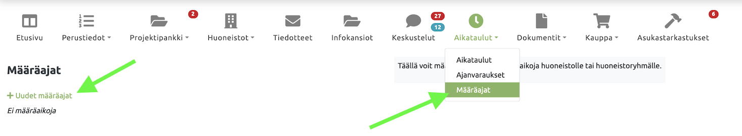 Täällä voit määritellä tärkeitä määräaikoja huoneistolle tai huoneistoryhmälle.