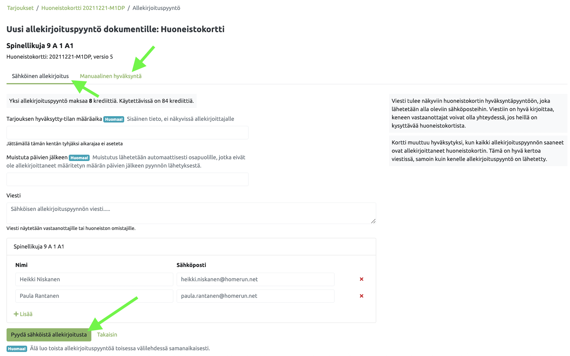 Voit lähettää sähköisen allekirjoituspyynnön huoneistokortille seuraavasti.