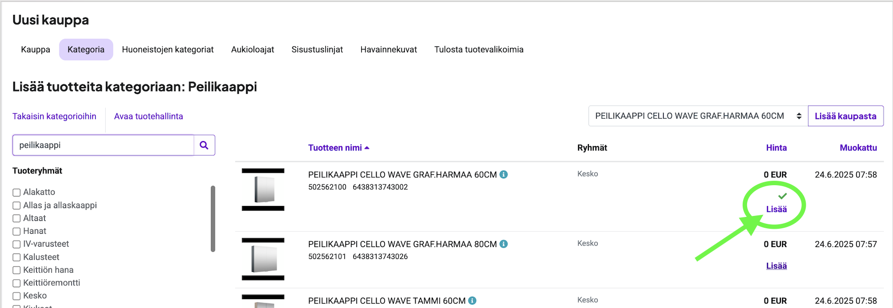 Tuotteen lisääminen kategoriaan onnistuu helposti painamalla "Lisää"‑nappia kerran. Napin yläpuolelle ilmestyy vihreä ruksi, joka tarkoittaa, että tuote on lisätty kategorian alle.