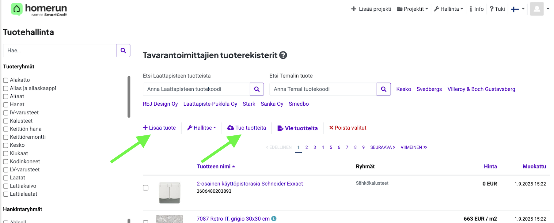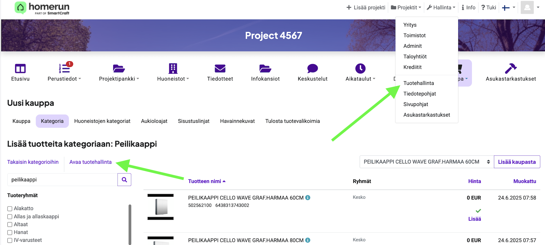 Voit hakea lisää tuotteita kauppaan tuotehallinnan sivun kautta, josta näet eri tavarantoimittajien tuoterekisterit. Pääset tuotehallinnan sivulle kahden eri napin kautta. Nuolet kuvassa osoittavat, missä nämä napit sijaitsevat.