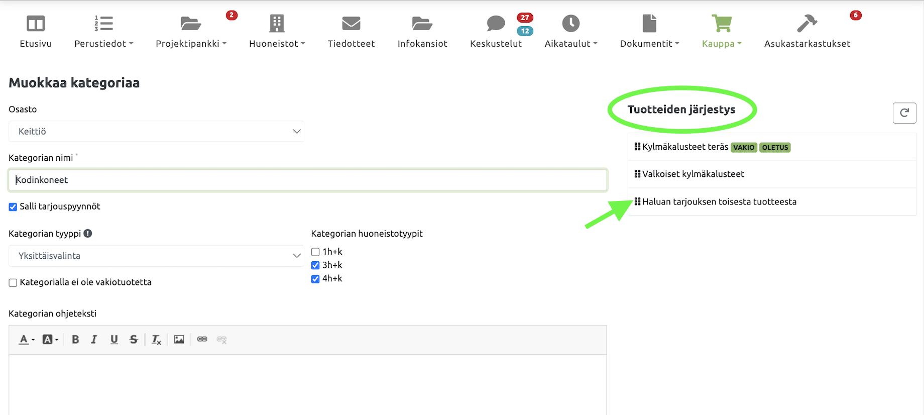Voit vaihtaa tuotteiden järjestystä painamalla +Muokkaa kategoriaa -painiketta.
