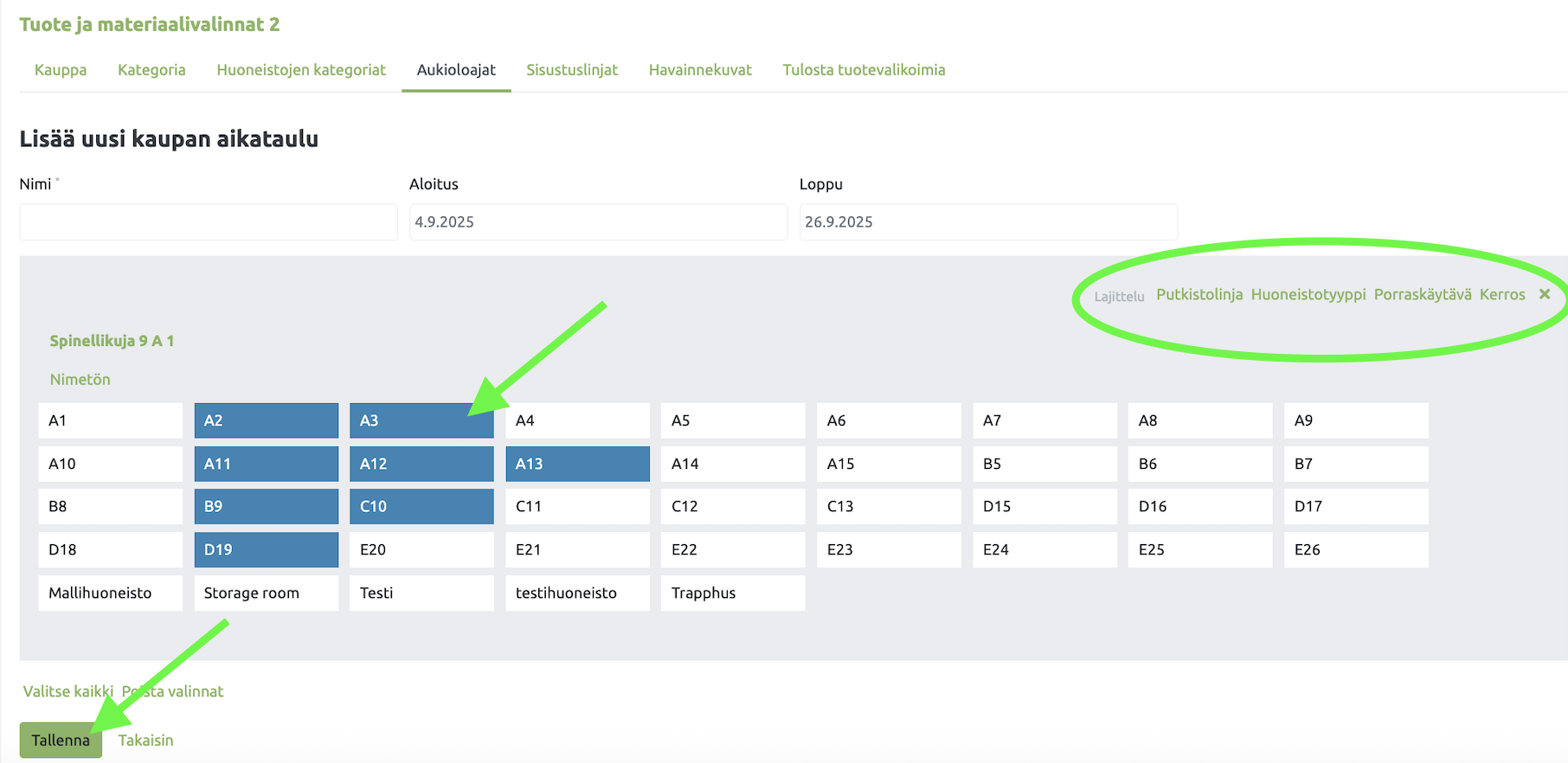 - Valitse halutut huoneistot ja määritä niille aukioloaika.