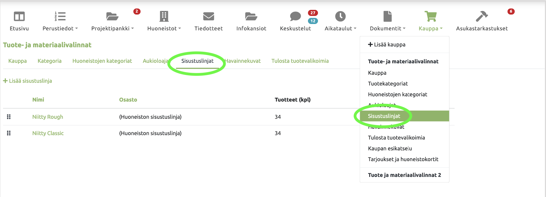 - Vaihtoehtoisesti voit valita "Koko huoneiston sisustuslinja", jolloin linja näkyy kauppasivun yläosassa.