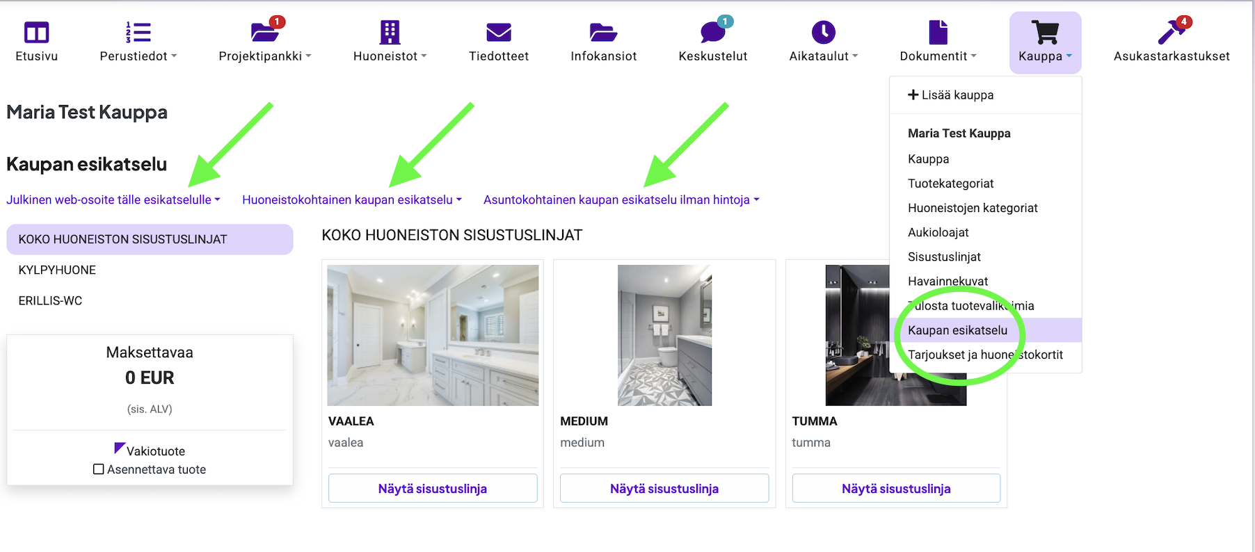 Kaupan esikatselussa voit kopioida julkisen web-osoitteen sekä tarkastella huoneistokohtaista ja asuntokohtaista esikatselua.