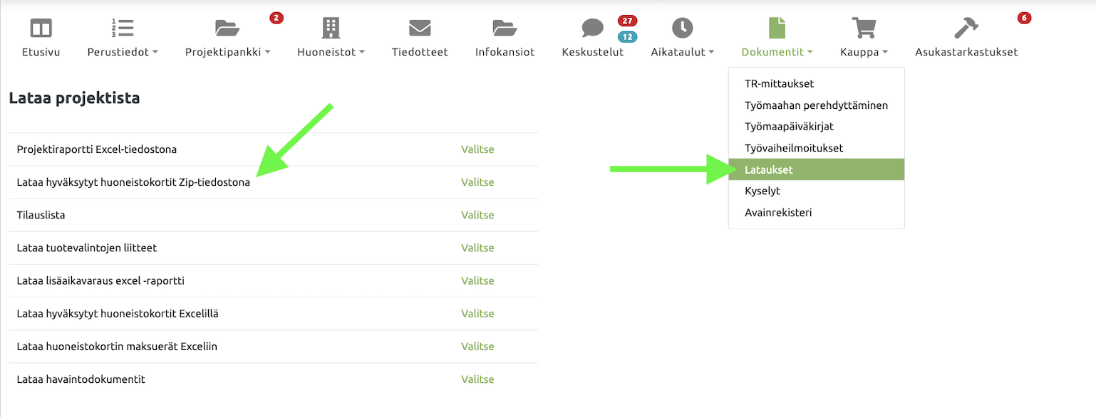 Voit tulostaa huoneistokortit Dokumentit → Lataukset -välilehden kautta. Tulostusasetukset voidaan määrittää joustavasti sen mukaan, mitä sisältöä olet tulostamassa.